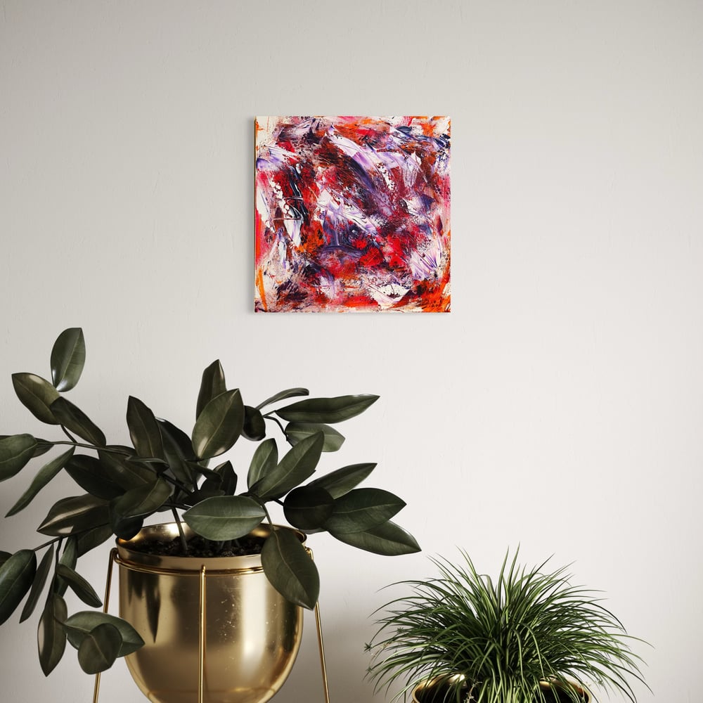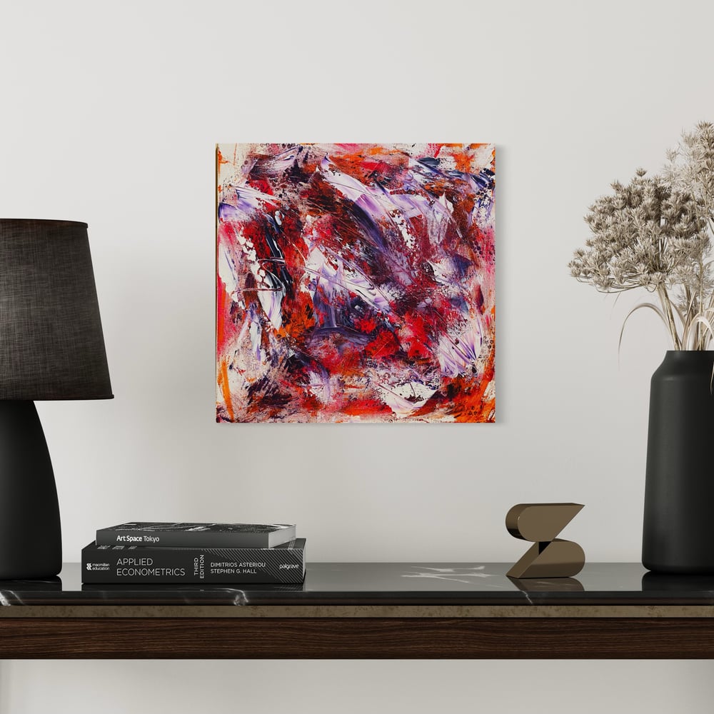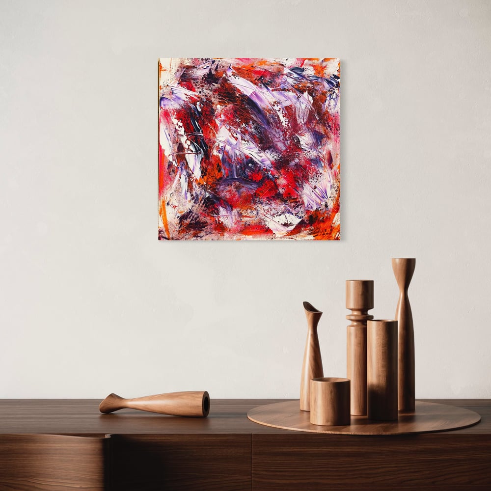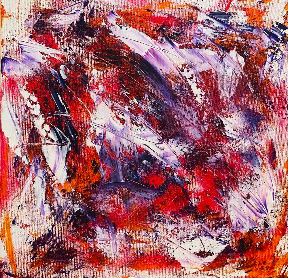 This resulted in 'Optimism' based on brisk and joyous stokes to produce a light and colourful mix on the canvas. Alizaren red went on first using a kitchen roll; burnt orange followed on a hollow roll of stiff plastic used to protect a bottle; purple was applied with a hand sized bubble wrap bag before white was smeared on with a spatula and then the whole piece scored with the spatula edge. Boy, did that make me feel better. Hope you like it.